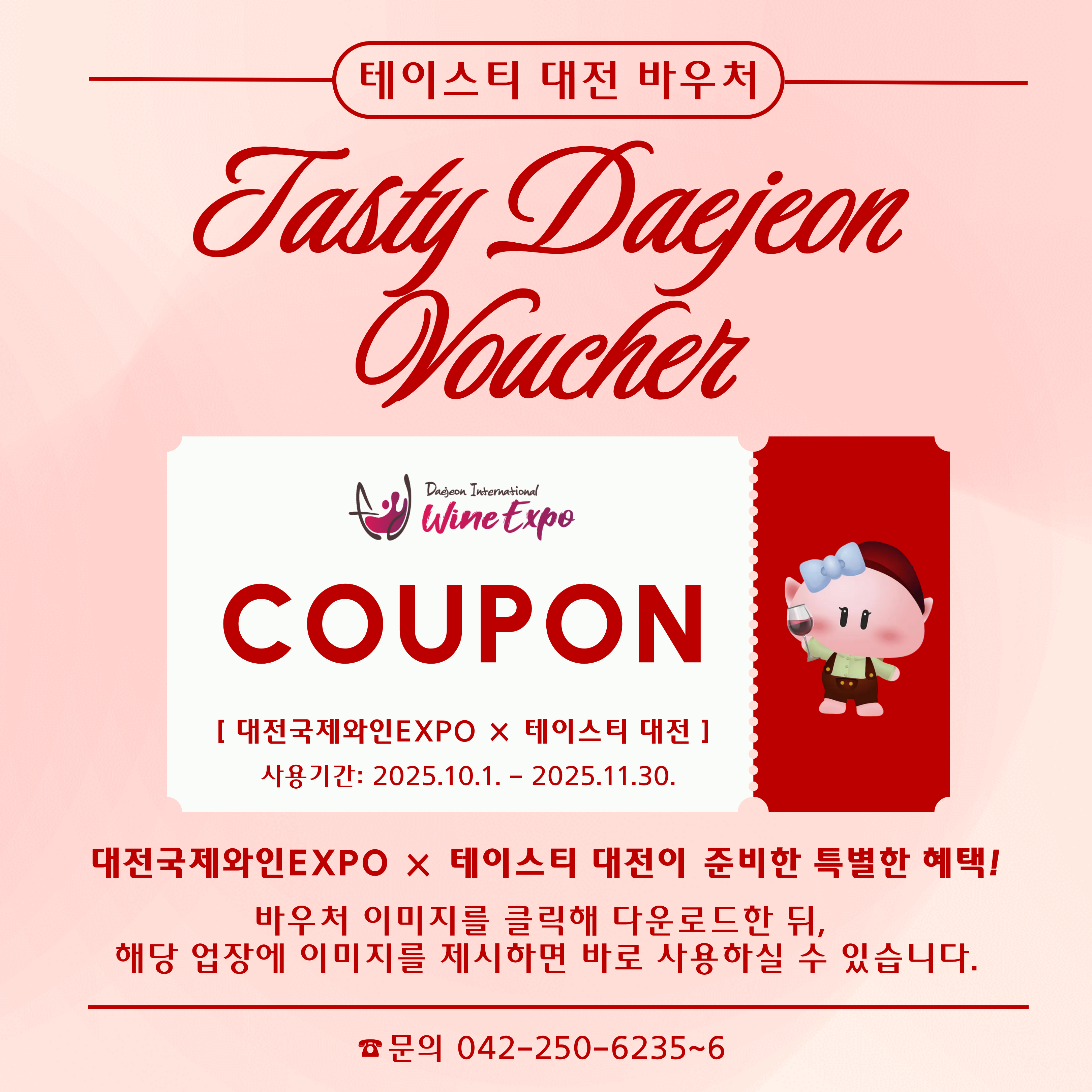 테이스티 대전은 2025 대전국제와인엑스포와 대전 지역 음식점 및 카페, 숙박업소 등과의 공동제휴프로모션입니다. 10월 01일부터 11월 30일까지 와인엑스포 바우처를 지참한 이용고객에 한하여 해당 음식점에서는 특정 와인 및 메뉴 가격할인을 제공합니다. 특히, 대전지역 음식점에서는 대전 지역음식과 와인의 특별한 페어링까지 경험해보실 수 있습니다.